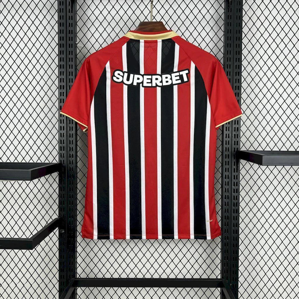A camiseta São Paulo - Away é a versão utilizada pelo Tricolor nas partidas fora de casa, tradicionalmente marcada pelo vermelho vibrante e detalhes em branco e preto. Este modelo carrega toda a identidade histórica do clube em um design imponente, que destaca o escudo bordado no peito e a força da camisa número dois. Produzida com tecido leve e respirável, proporciona conforto, mobilidade e excelente caimento tanto para os dias de torcida quanto para o uso casual. É uma escolha certeira para quem vive a paixão pelo São Paulo além das quatro linhas.